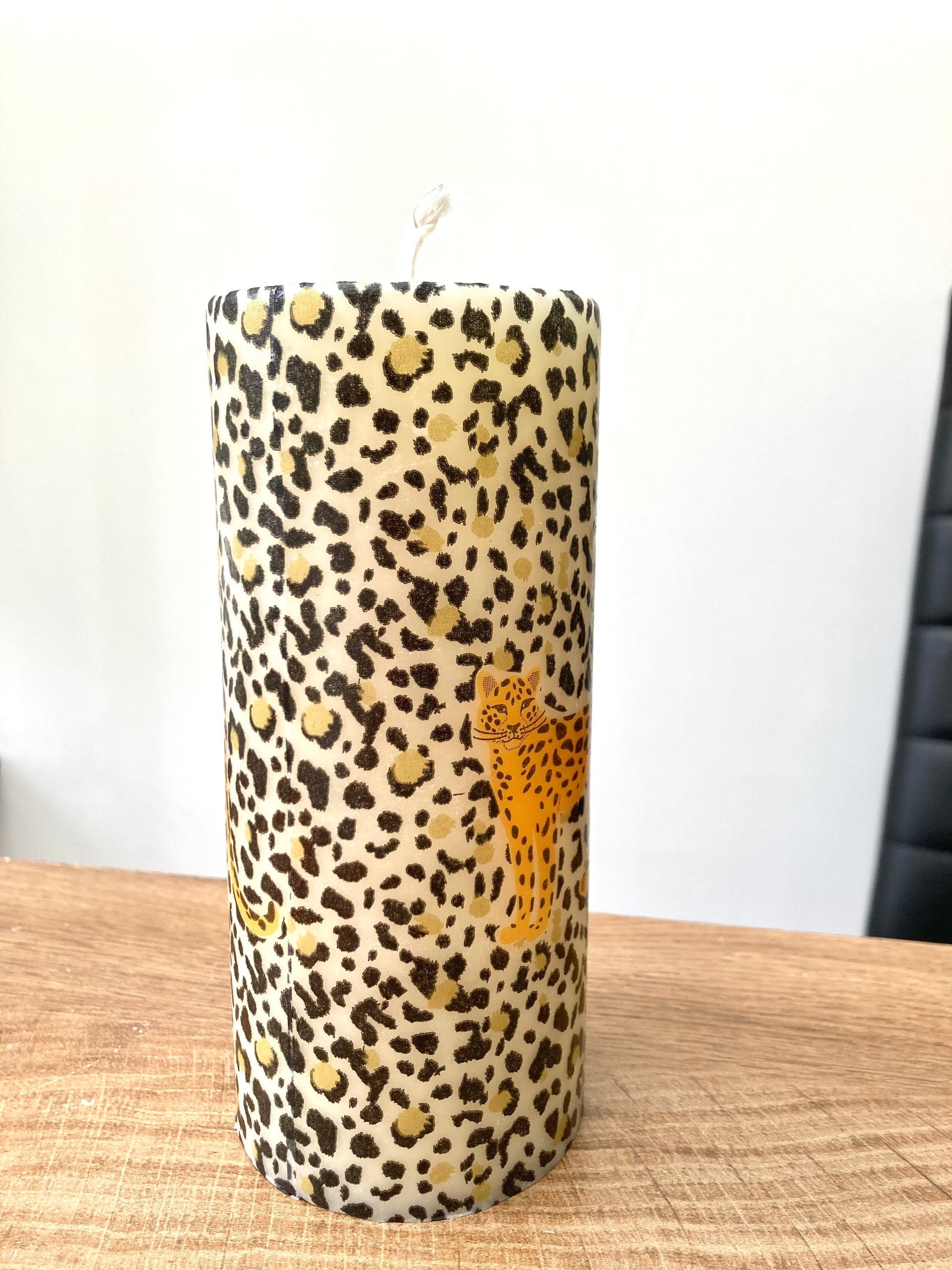 Unique cheetah pattern. Perfect for home decoration and as a gift. Pattern paper is heat transferred and melt into the candle. The candle burns for 55 hours.