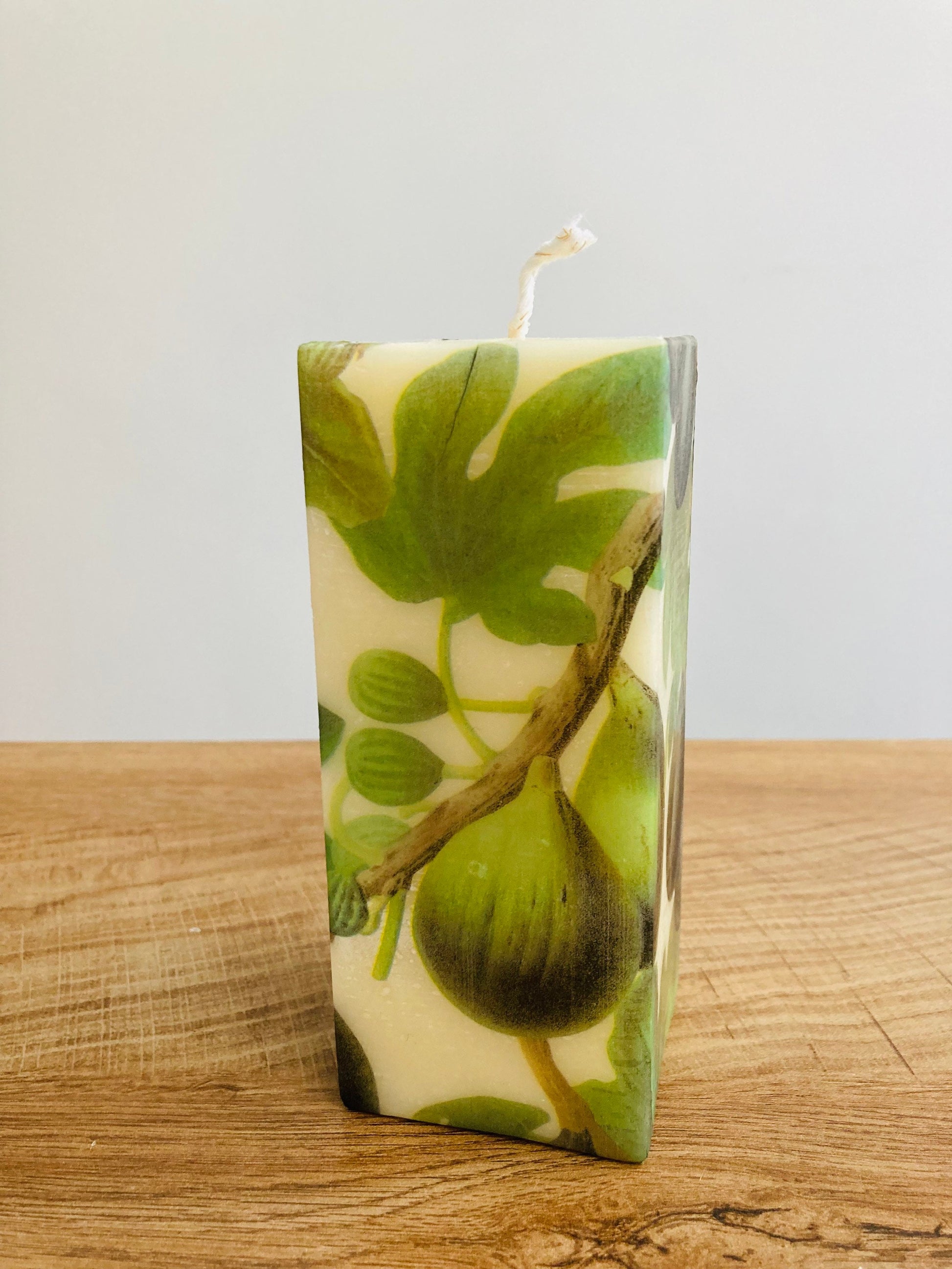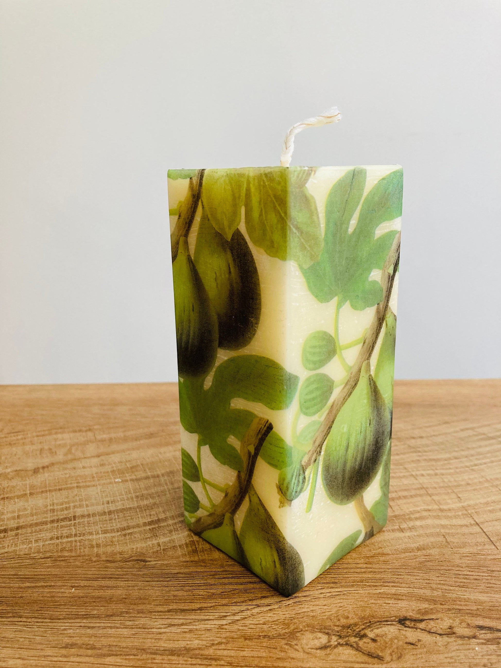Nature inspired figs theme candle. This luscious candle is made from beeswax, an amazing wax material perfect to freshen up indoor air without relying on added fragrance oil. The unique square block candle design not only elevate the pattern art, but also gives a modern touch to any home decor. Perfect for home decoration and as a gift. Pattern paper is heat transferred and melt into the candle.