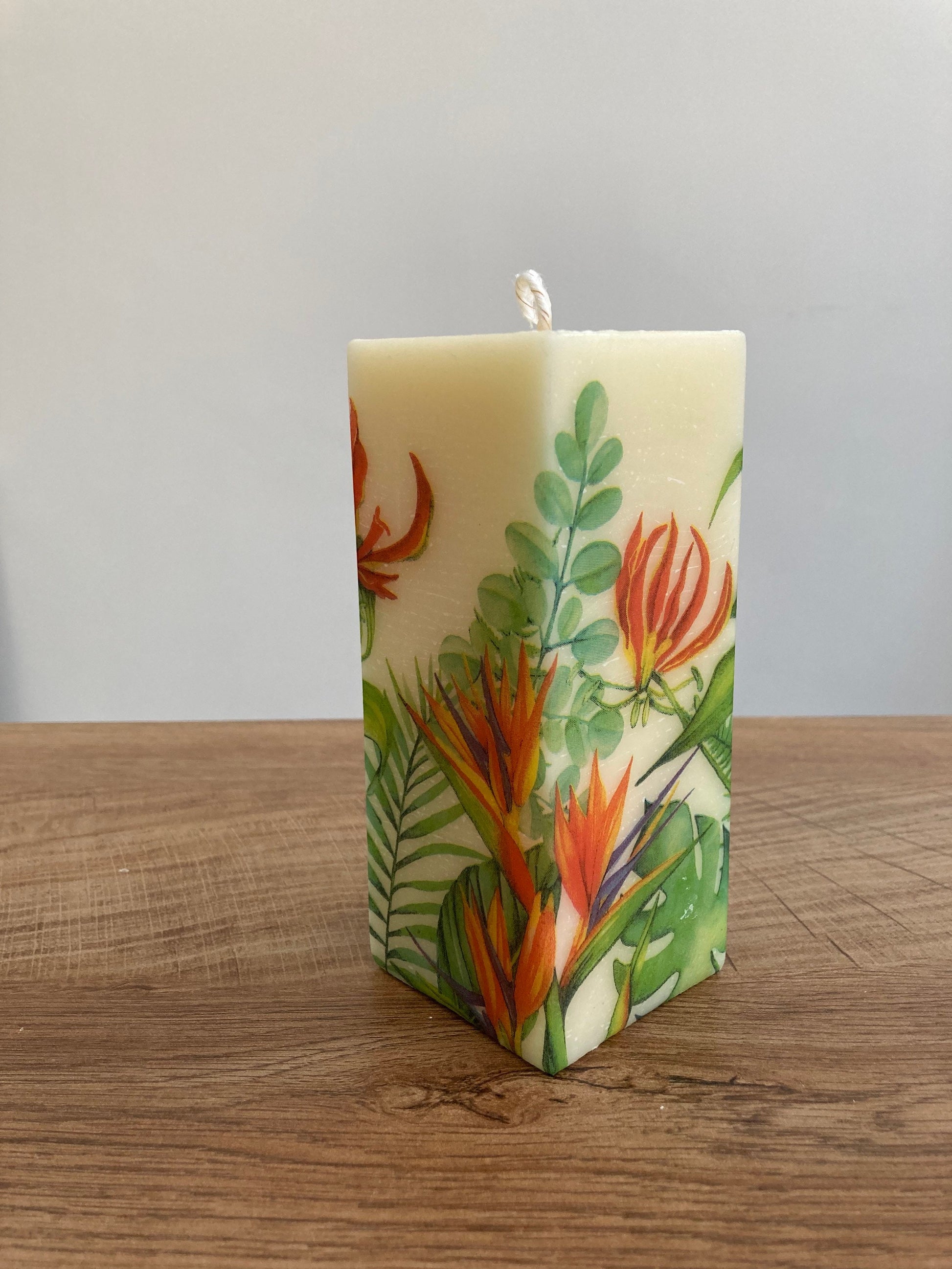 Tropical floral theme candle. The unique square block beeswax candle design not only elevate the pattern art, but also gives a modern touch to any home decor. Perfect for home decoration and as a gift. Pattern paper is heat transferred and melt into the candle. The candle burns for 55 hours.