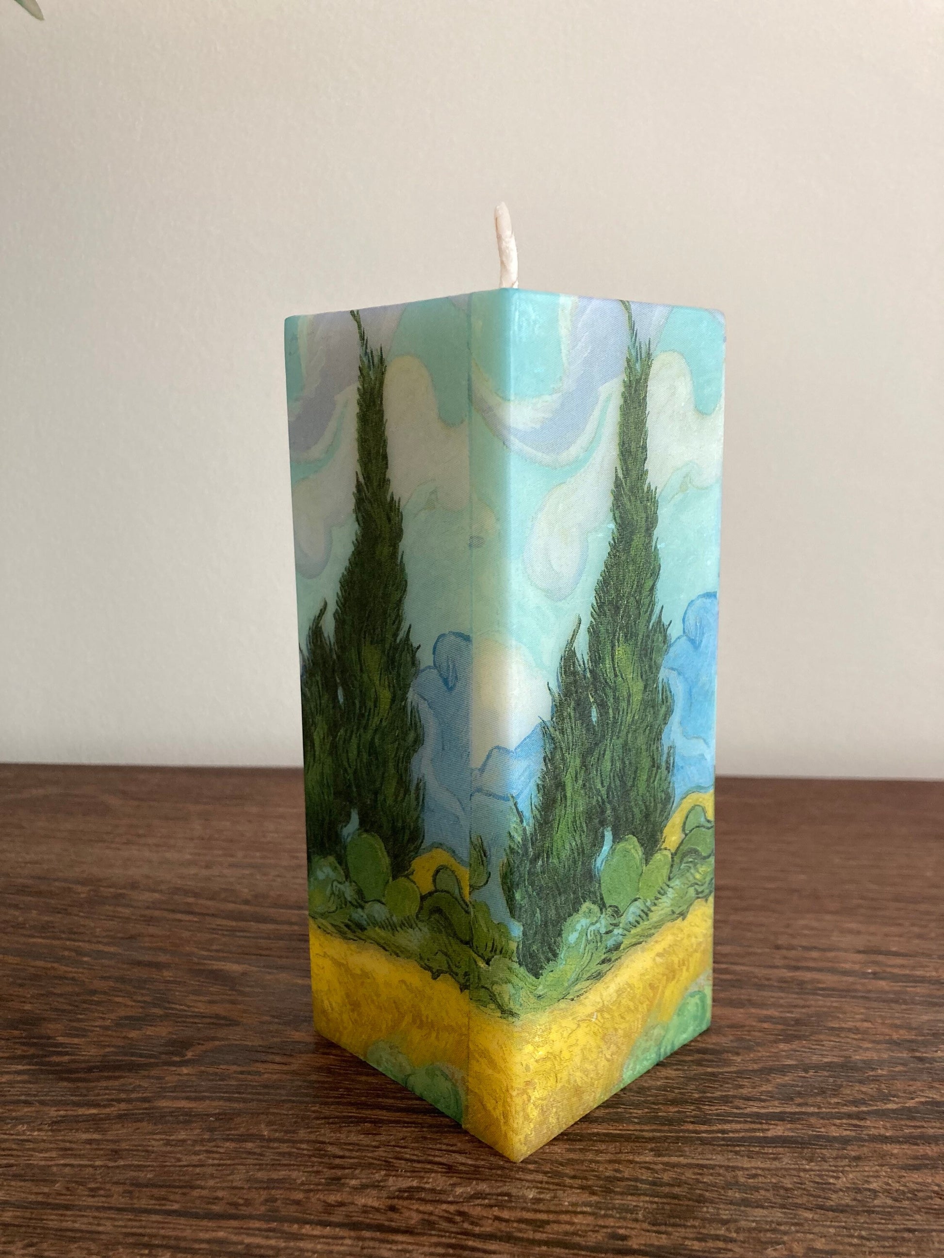 A well known masterpiece by Van Gogh 'Wheat Field' candle. This art candle brings an artistic touch to any home decor. Perfect for home decoration and as a gift. Pattern paper is heat transferred and melt onto the candle.